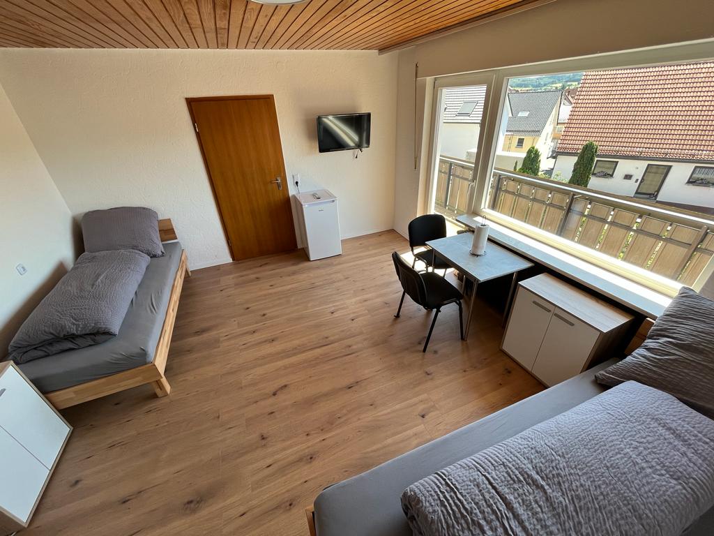 - Zimmer mit Bett (90x200) incl. Bettwäsche, Nachtkästchen, Internet bis zu 400mbit, TV, Tisch und Stühlen, sowie einem kleinen Kühlschrank