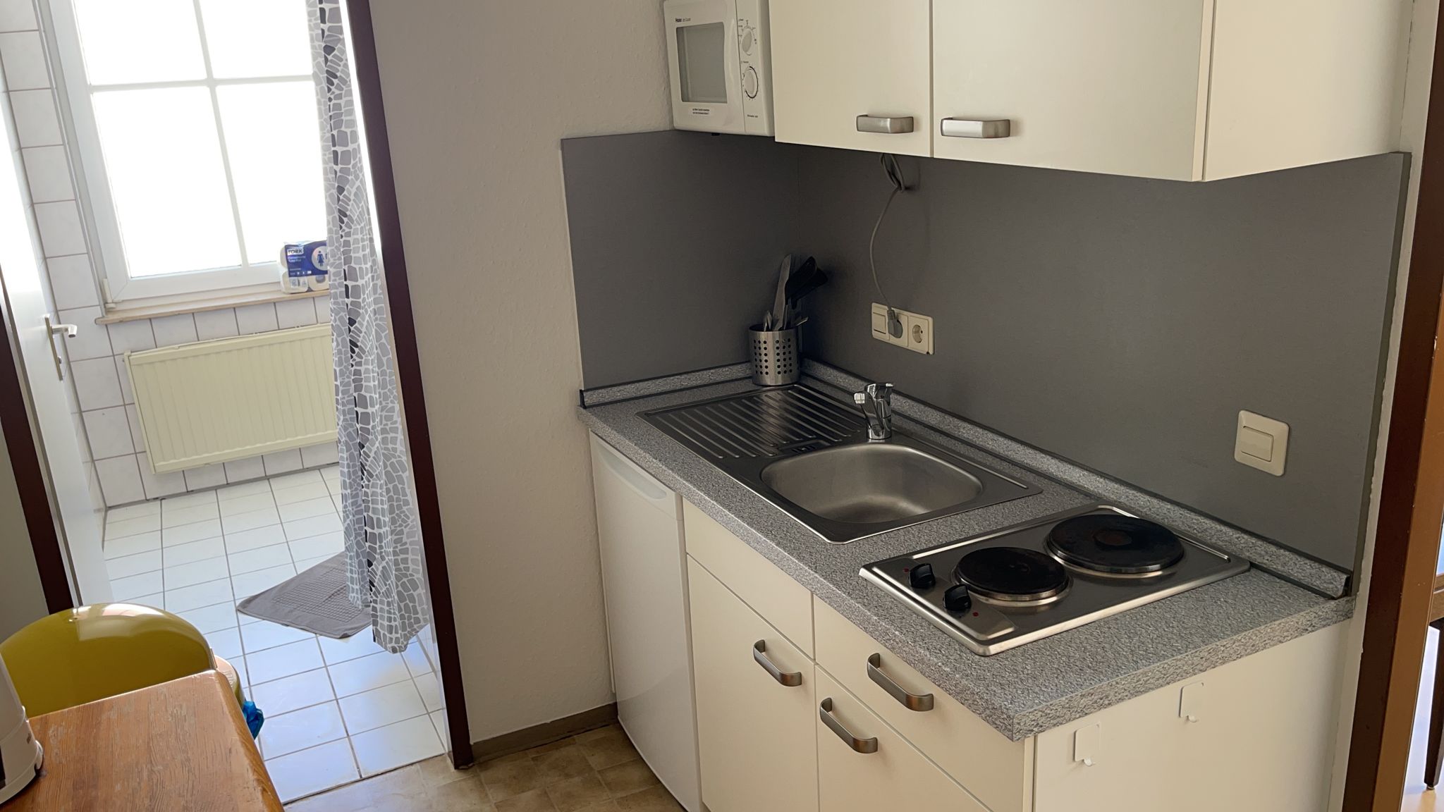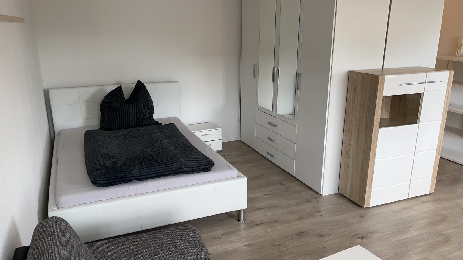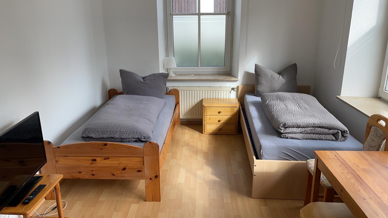 - Zimmer mit Bett (90x200) incl. Bettwäsche, Nachtkästchen, Internet bis zu 400mbit, TV, Tisch und Stühlen, sowie einem kleinen Kühlschrank