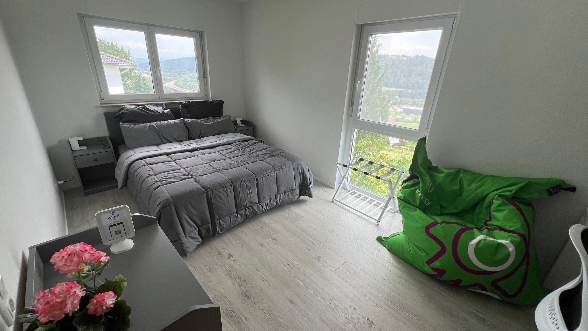 - Zimmer mit Bett (90x200) incl. Bettwäsche, Nachtkästchen, Internet bis zu 1.00mbit, TV, Tisch und Stühlen, sowie einem kleinen Kühlschrank