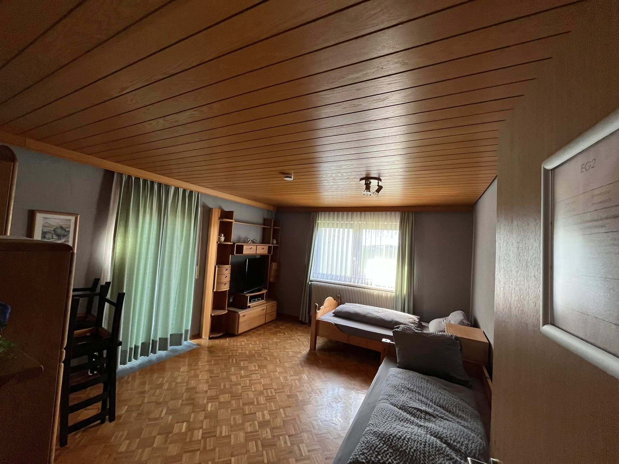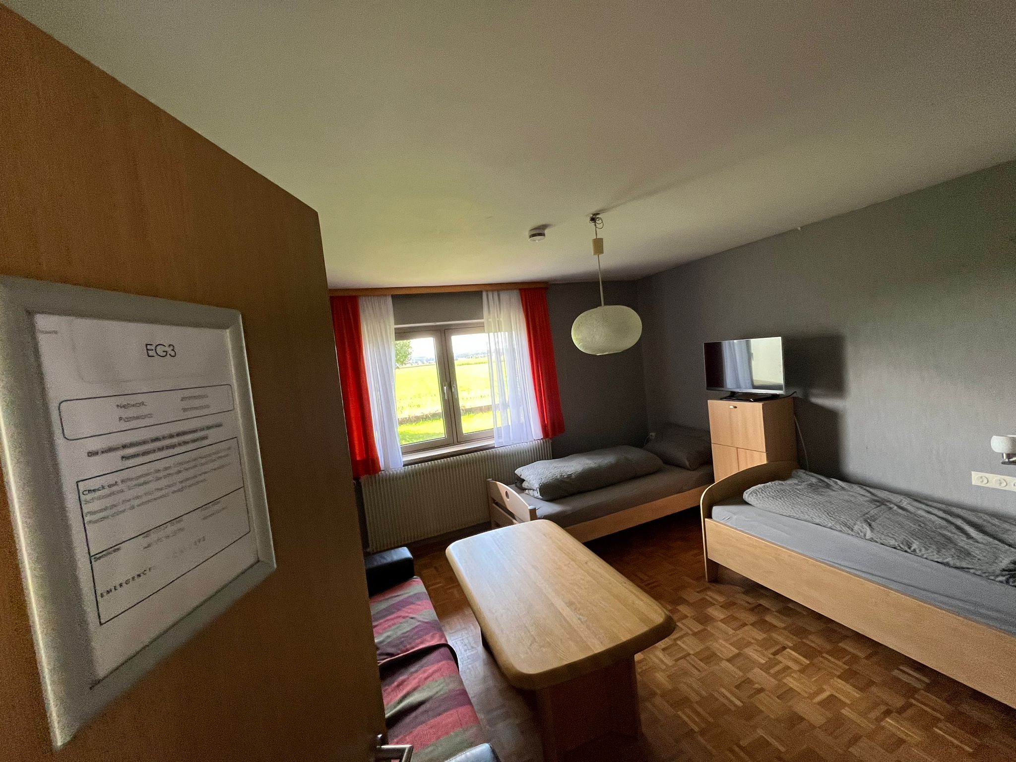 - Zimmer mit Bett (90x200) incl. Bettwäsche, Nachtkästchen, Internet bis zu 400mbit, TV, Tisch und Stühlen, sowie einem kleinen Kühlschrank